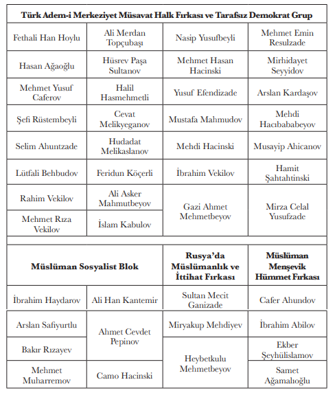 1917’deki iki ihtilal arası dönemde örgütlenme çalışmaları hızlanan fırkaların ilk önemli sınavı, Rusya’nın siyasal düzenini biçimlendirmesine umut edilen Kurucu Meclis seçimleri oldu. 26-28 Kasım 1917 tarih aralığında yapılan seçimlerde Kafkasya’nın güneyinde Gürcü Menşevikler 11, Müsavatçılar 10, Taşnaklar 9, Müslüman Sosyalist Blok 2, Bolşevikler 1, Sosyalist İhtilalciler 1, Hümmetçiler 1, İttihatçılar 1 sandalye kazandılar[34]. Seçimin ortaya çıkardığı manzaradan hoşnut olmayan Bolşeviklerin izledikleri siyaset sonucunda yasama kurumu işlevsiz hâle geldi (Ocak 1918). Bütün umutlarını parlamenter demokrasiye bağlayan mahkûm milletler, meclisin feshedilmesinden dolayı hayal kırıklığına uğradılar. Brest-Litovsk Konferansı döneminde aktüellik arz eden self-determinasyon ilkesi onlar açısından yeni bir nefeslik oldu. Bu ilke doğrultusunda Tiflis’te toplanan Kafkasyalı mebuslar, bölgesel olarak Kurucu Meclise seçilen vekil sayısının üç kat arttırılarak aritmetik oluşturulması ve yeni mebusların da katılımıyla Seym adlı yasama kurumunun açılmasına karar verdiler. İfade edildiği üzere oluşturulan Seymde Gürcü Menşevikler 33, Müsavat 30, Taşnaksutyun 27, Müslüman Sosyalist Blok 7, Sosyalist İhtilalciler 5, Hümmet 4, İttihat 3, Kadetler 1, Gürcü Nasyonal Demokratlar 1, Gürcü Sosyal Federalistler 1 mebusla temsil olundular[35]. Yasama dönemine 23 Şubat 1918’de başlayan Seym çatısı altında Kafkasya’nın güneyinde sayıca kalabalık olan milletleri temsilen üç fraksiyon oluşturuldu. Kafkasyalı Türklerin temsil olundukları Müslüman Fraksiyonundaki mebusların fırkalara göre dağılımı şöyleydi: