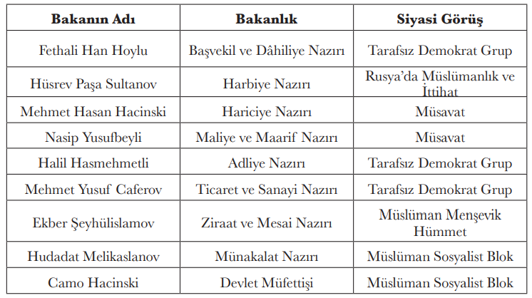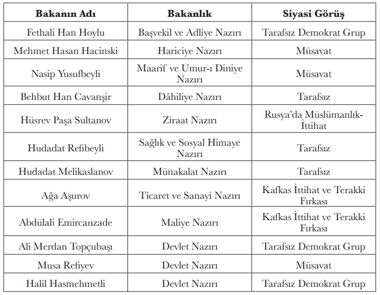 İfade edilenlerden görüldüğü üzere, özellikle Batum Konferansı sırasında Osmanlı Devleti’ne birleşme eğiliminde artış meydana geldi ve Kafkasyalı Türkleri temsil eden ahali vekilleri ellerindeki binlerce imzayı muhtevi itimatnameler olduğu hâlde Osmanlı Heyeti ile görüşmek amacıyla Batum’a akın ettiler[49]. Ahali vekillerinin ilk elden sundukları talepnamelerin muhatabı olan Osmanlı devlet ricali ise ideal olan ile mümkün olan arasında seçim yapmak zorunda kaldı ve uluslararası sistemde dost veya muhasım devletlerin kabul edebileceği bir formülü uygulamaya koydu. İlk önce Seymdeki Müslüman Fraksiyonu Azerbaycan Millî Şurasına dönüştürüldü (26 Mayıs 1918). Bundan sonra Osmanlı Devleti’nin de teşvikiyle Kafkasya’nın güneyindeki Türkler ile diğer Müslüman milletlerin siyasal vahdeti olarak Azerbaycan Cumhuriyeti ilan edildi (28 Mayıs 1918). Azerbaycan Millî Şurasının Tiflis’teki toplantı odasında ilan edilen cumhuriyetin ilk kabinesindeki bakanların siyasal fırkalara göre dağılımı şöyleydi: